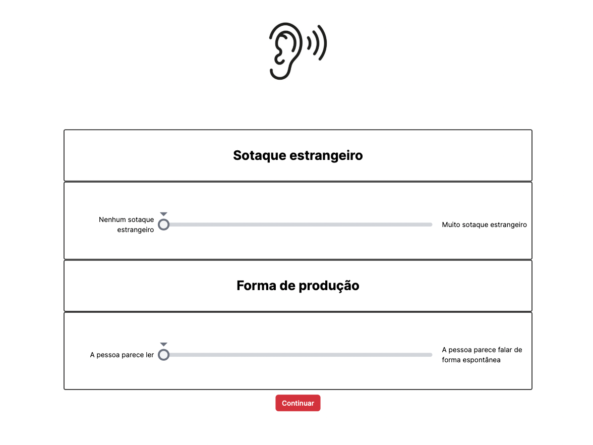 In the first pilot study, native European Portuguese speakers rated the uterances on the degree of target-likeness: target-like (TL) vs. NTL (non-target-like) on a slider scale from 0 to 100, where 0 was no foreign accent and 100 — very strong foreign accent , and the manner of production, where 0 was the person seems to read and 100 — the person seems to speak spontaneously (approx. 15 minutes)