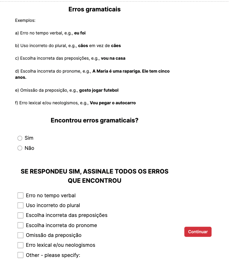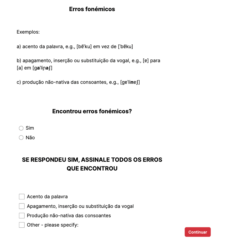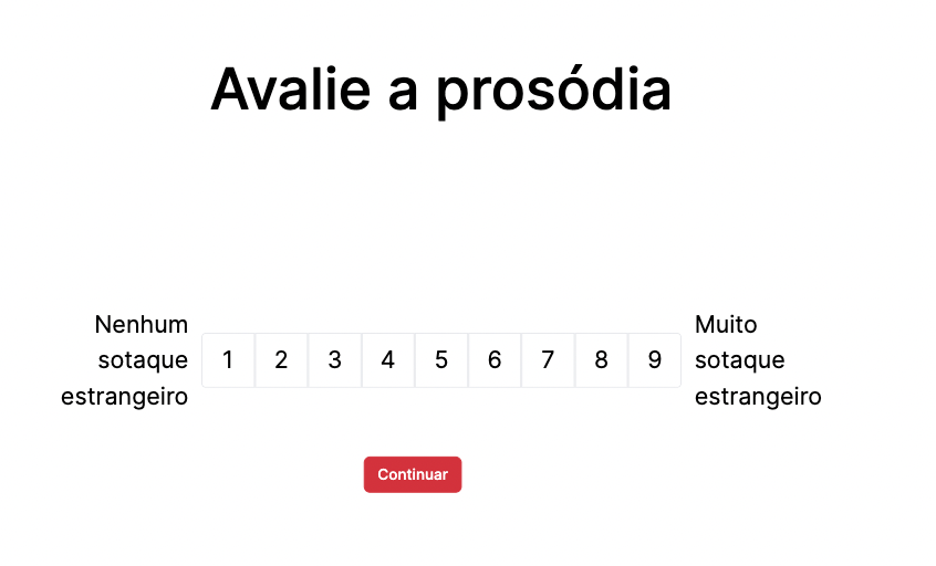 In this study, two experienced linguists — native monolingual speakers of European Portuguese — rated the utterances on the goodness of prosody (in pairs), on a Likert scale from 1 to 9, where 1 was no foreign accent and 9 — very strong foreign accent. They also coded the utterances for grammatical and phonemic errors.