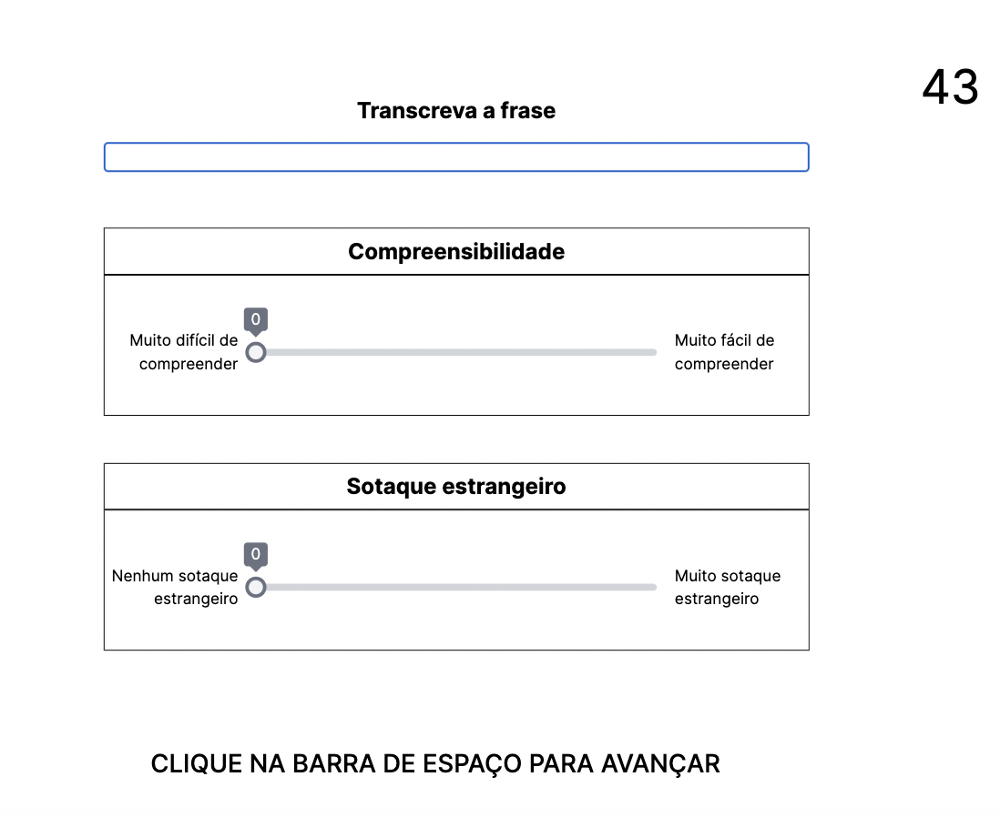 The raters were asked to transcribe the utterance in a special field for intelligibility and rate on a 100-point slider scale for comprehensibility and accentedness, in this order.