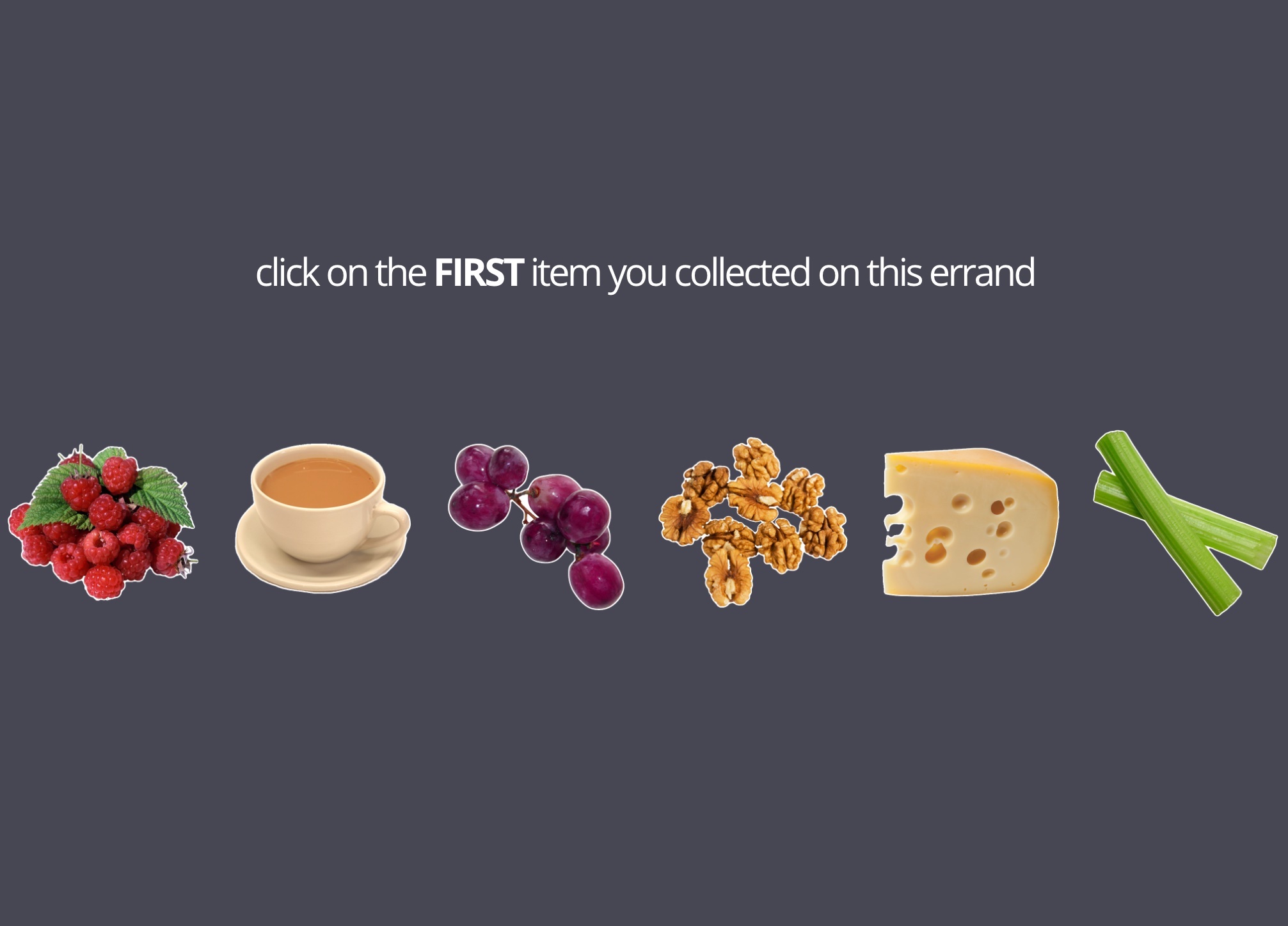 After visiting an aisle in either store, participants view a visual stimulus "in" or above that aisle. They are instructed to remember the order of these stimuli and the aisles that they appeared in.