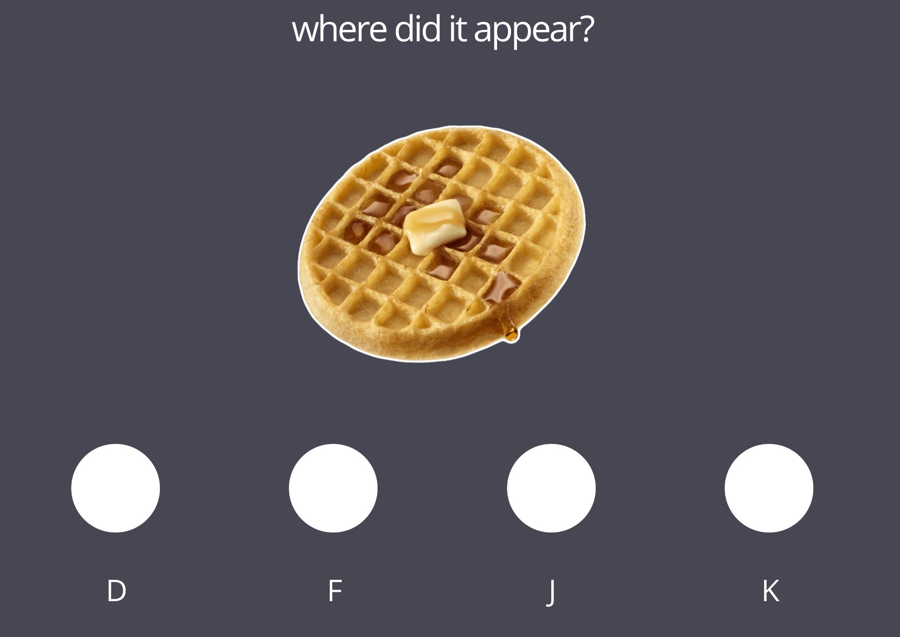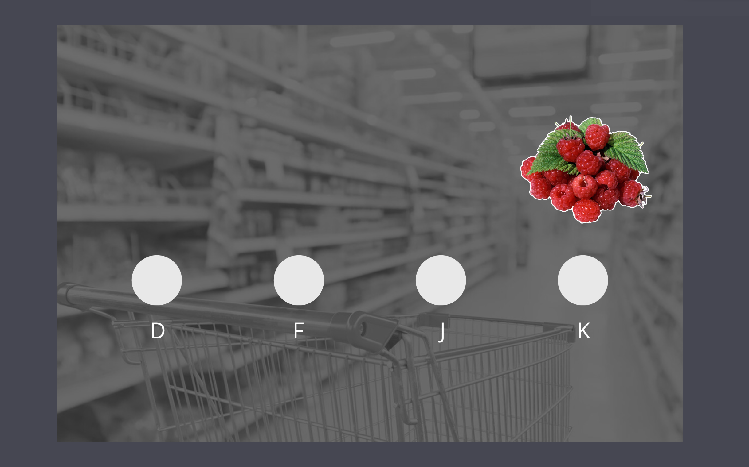 During this task, participants embark on a series of "errands" to two different stores: the pet store and the grocery store. During each errand, participants visit a sequence of aisles within each store, where each aisle is represented as a circle on the screen, and aisles are visited by pressing the corresponding keyboard key (D, F, J, or K). Critically, aisle sequences in one store follow the same pattern on each errand, which was learned during the pretraining task. Aisle sequences in the other store change with each errand. When going to the store with the learned ("predictable") aisle sequence, participants must visit the sequence of aisles from memory; in the other store, they are given explicit visual cues that indicate which aisle to visit next.